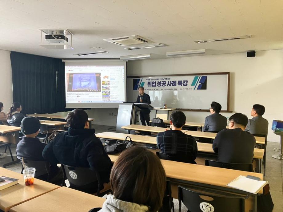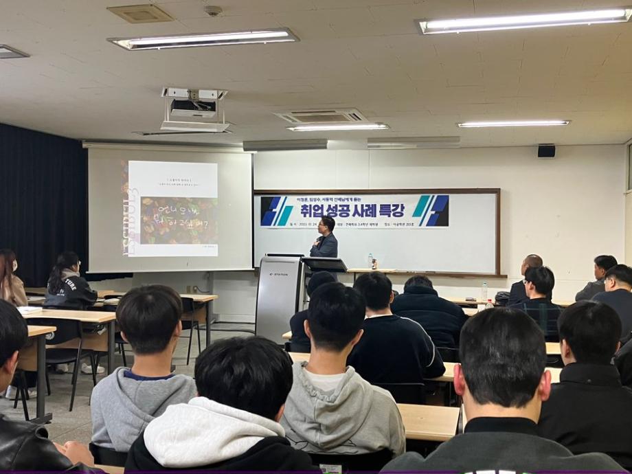 10월 24일 오후 이공학관 201호에서 ‘학과 선배가 들려주는 성공하는 건축인의 길’이란 주제의 재학생-선배 만남의 장이 펼쳐졌다. ㈜서림종합건설 서동억 대표(95학번), ㈜선진엔지니어링 임성수 상무(건축사, 95학번) ㈜칸그룹건축사 이정훈 대표(건축사, 98학번)가 초청되었는데, 이정훈 동문은 ‘건축’에 자신의 관심분야(유튜브, AI 등)를 연계, 융합하는 방식의 성공사례 소개했고, 임성수 상무는 대규모 건축사무소에서의 업무와 자기발전에 대해, 그리고 서동억 대표는 성공의 조건으로서 꿈과 목표의 구체화, 열정적 준비와 추진을 강조하였다. 행사를 통해 세 사람의 이야기 식 강의로 선후배간 공감대가 만들어져 재학생들로부터 많은 질문이 나왔는데, 이는 취업과 성공에 대한 학생들의 높은 관심을 보여 주는 것으로 풀이된다.