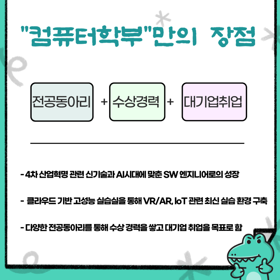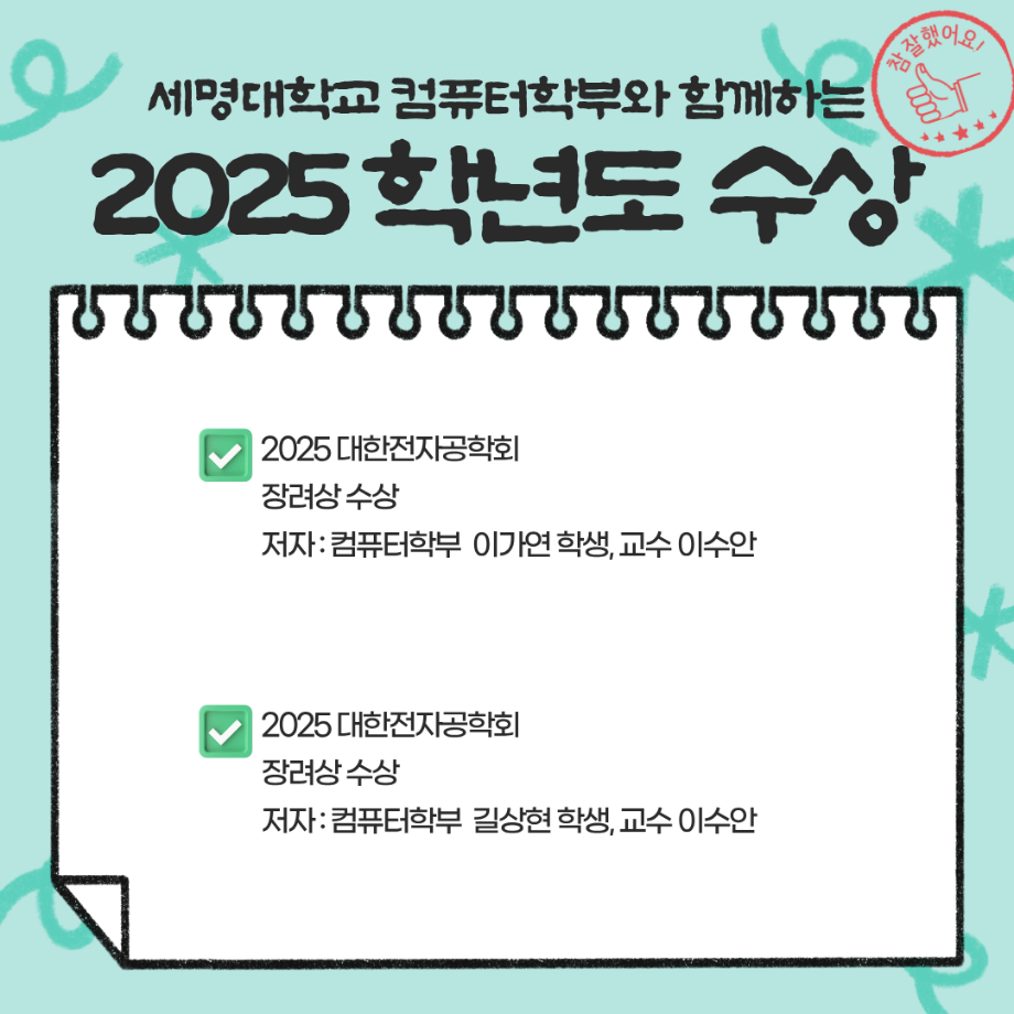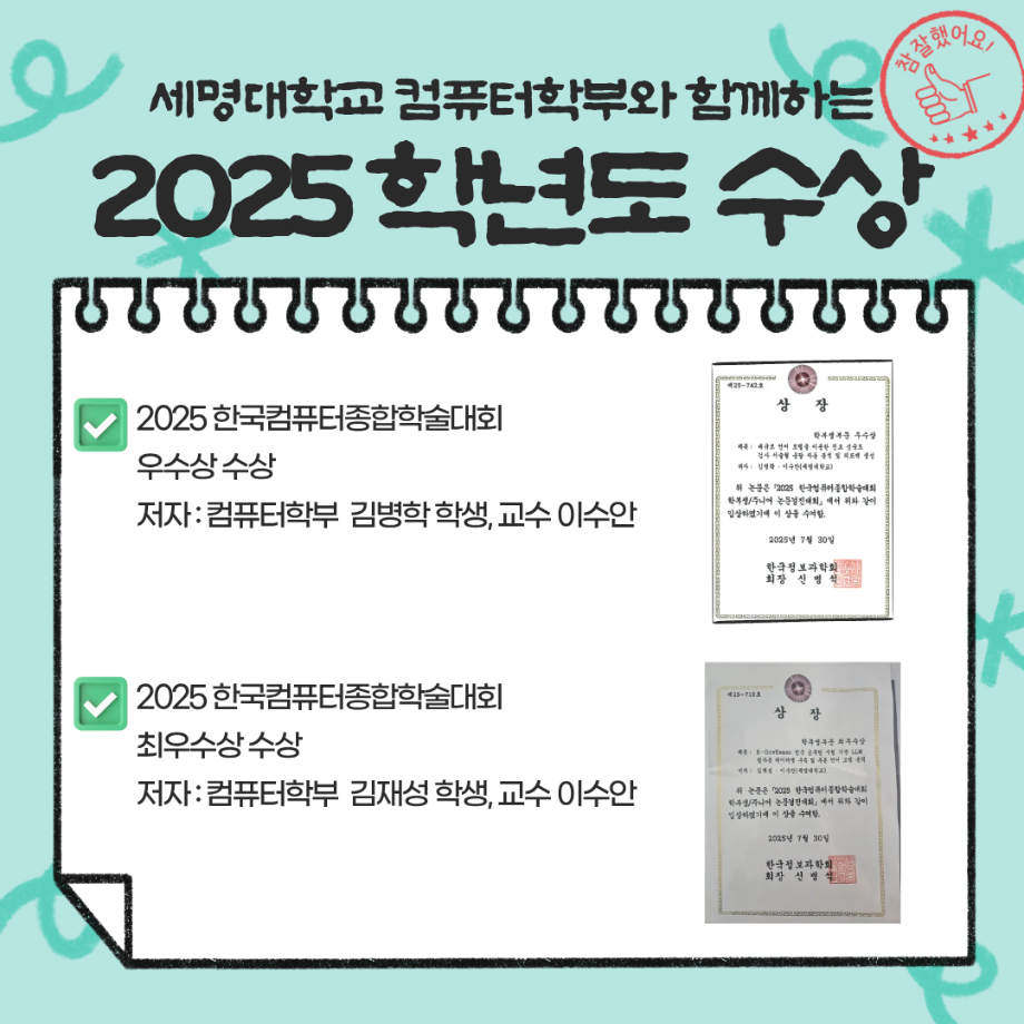 본문 시작 홈으로 학부활동 학부소개 학부활동 교육과정 커뮤니티 학부생활 입학안내 홈페이지가이드 학부갤러리 학부행사 학생회 활동 전공 동아리 학부갤러리 학부갤러리 페이스북 트위터 프린트 컴퓨터학부를 소개합니다 컴퓨터학부 965 2025-12-30 . 목록 이전한국소프트웨어종합학술대회 (KSC2025) 다음 컴퓨터학부 이수안 교수 세계적 AI 학회 AAAI 2026 논문 채택 담당부서 : 컴퓨터학부 담당자 : - 연락처 : 043-649-1272 최종수정일 : 2024-10-26 만족도조사 만족도 조사 이 페이지에서 제공하는 정보에 대하여 만족하시나요? 매우만족 만족 보통 불만족 매우불만족