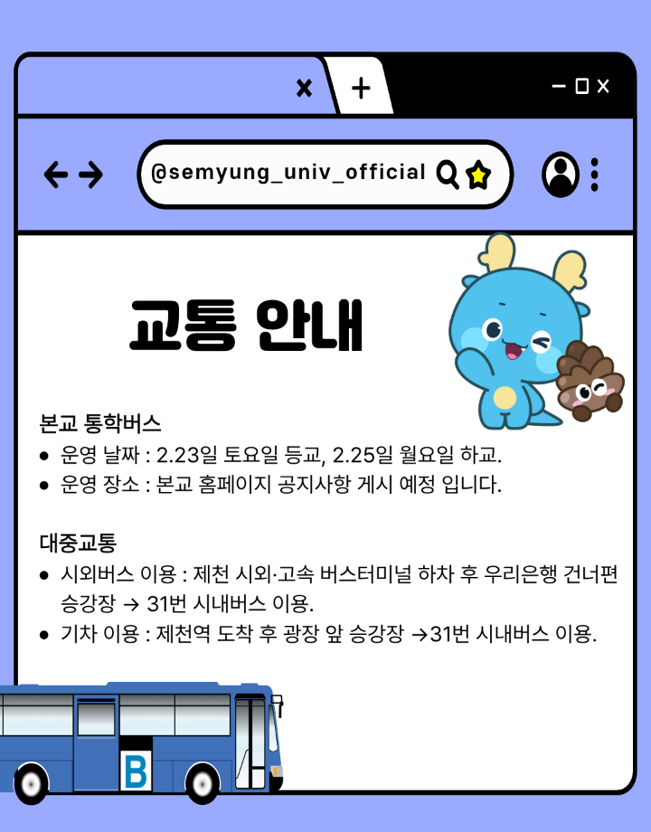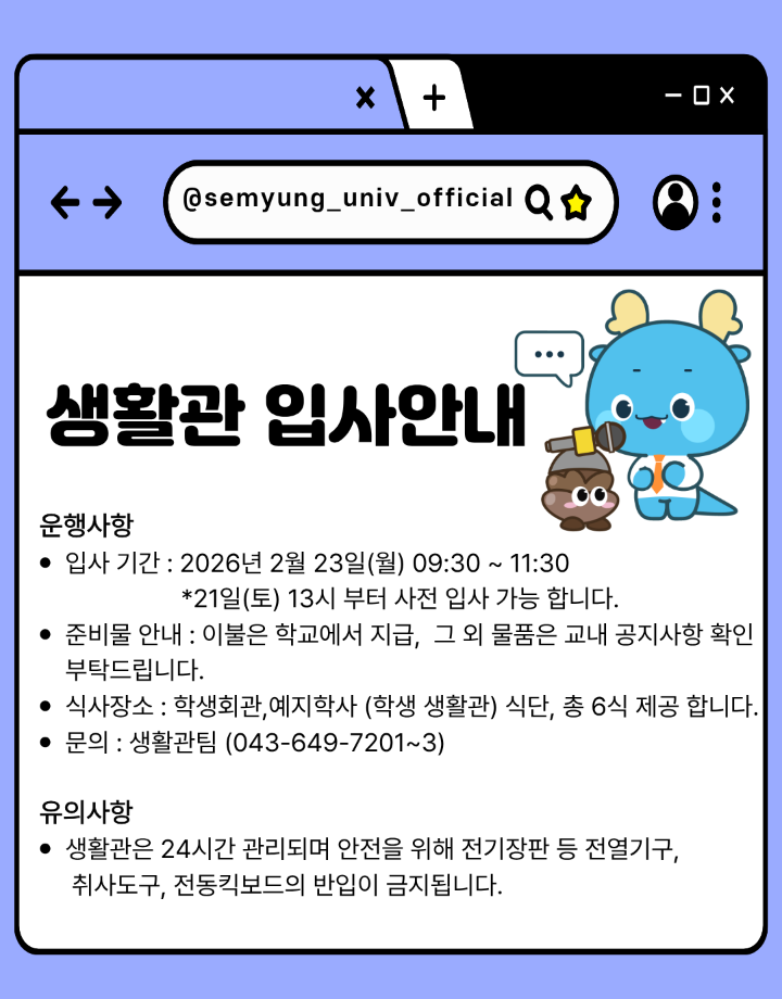 본문 시작 홈으로 학부활동 학부소개 학부활동 교육과정 커뮤니티 학부생활 입학안내 홈페이지가이드 학부갤러리 학부행사 학생회 활동 전공 동아리 학부갤러리 학부갤러리 페이스북 트위터 프린트 2026학년도 신입생 '꿈 설계학기오리엔테이션' 시행 안내 컴퓨터학부 577 2026-02-13 🌸 세명대학교 신입생 여러분, 환영합니다! 🌸 ✨2026학년도 신입생을 위한 꿈 설계학기 안내✨ -일정 : 2026.02.23(월) ~ 02.25(수) -대상 : 2026학년도 신입생 ✔ 졸업인증제 필수 인성교육 4시간 인정 ✔ 참가비 전액 학교 지원 목록 이전세명대학교 데이터지능연구실, 국제학술대회 'IEEE BigComp 2026'서 우수논문상(Runner-Up) 수상 다음 새해 복 많이 받으세요 담당부서 : 컴퓨터학부 담당자 : - 연락처 : 043-649-1272 최종수정일 : 2024-10-26 만족도조사 만족도 조사 이 페이지에서 제공하는 정보에 대하여 만족하시나요? 매우만족 만족 보통 불만족 매우불만족