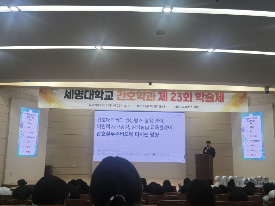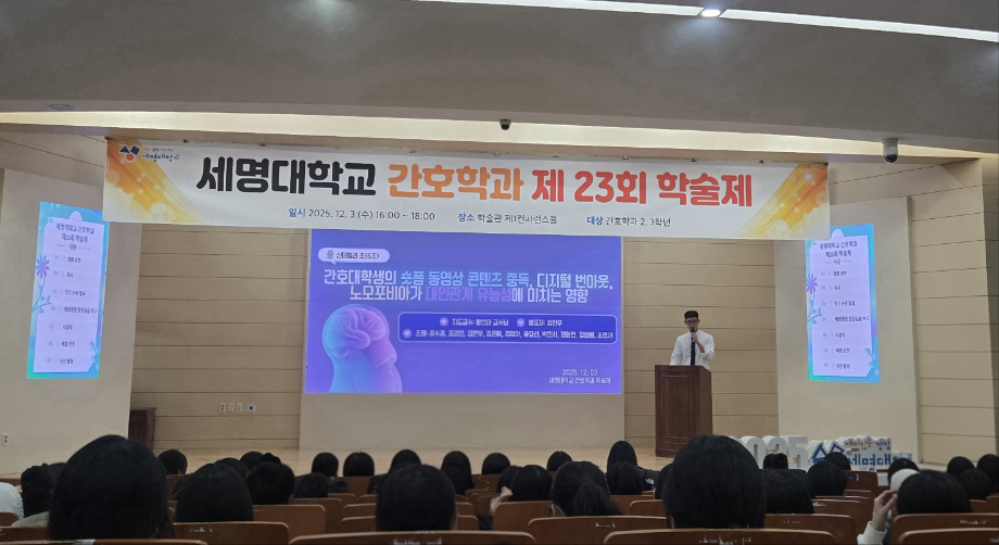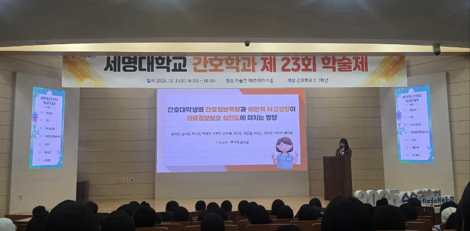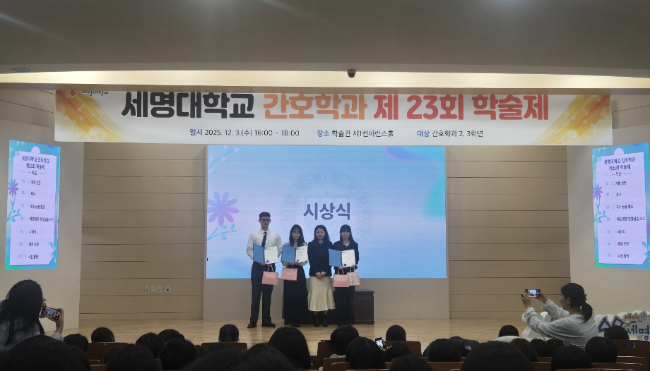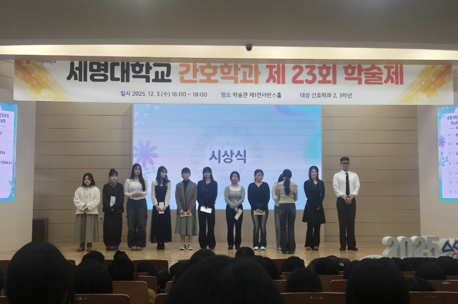 본문 시작 홈으로 커뮤니티 학과소개 교수소개 교육과정 학과소식 학과특성화 사업 커뮤니티 홈페이지가이드 포토갤러리 학사일정 포토갤러리 학생회 학과동아리 학과 취업정보 동창회 학과운영개선의견 발전기금 포토갤러리 페이스북 트위터 프린트 제 23회 간호학과 학술제 간호학과 522 2025-12-08 12/3 진행된 📝 2024 학술제 발표와 ✈ 해외 인턴십 경험 공유 후기가 학과 블로그에 업로드되었습니다. 발표 현장과 생생한 경험담이 궁금하다면 아래 링크를 확인해주세요 👇 🔗 링크 https://blog.naver.com/nursing_smu_official/224099825798 목록 이전📍 ‘임상실습 안전사고 ZERO를 위하여’ 특강 담당부서 : 간호학과 담당자 : - 연락처 : 043-649-1357 최종수정일 : 2024-10-26 만족도조사 만족도 조사 이 페이지에서 제공하는 정보에 대하여 만족하시나요? 매우만족 만족 보통 불만족 매우불만족
