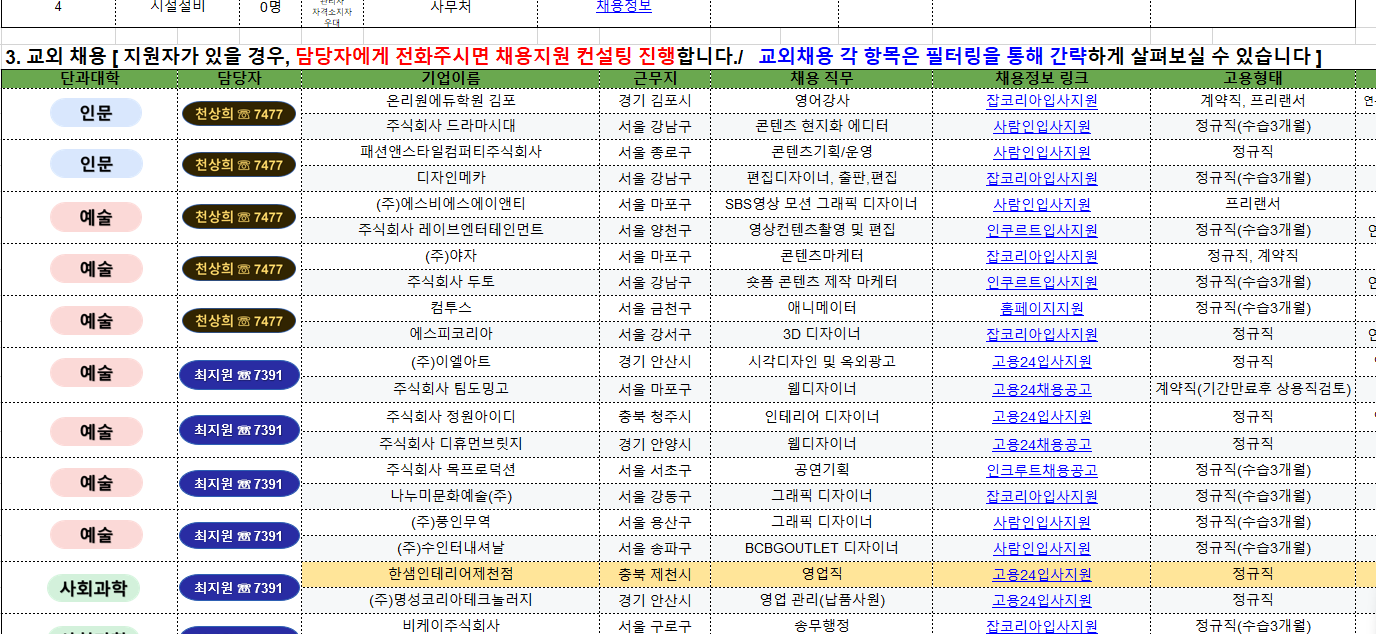본문 시작 홈으로 시영소식 학과소개 학과과정 시영소식 입학/취업 AI 학과자랑 SNS소통 홈페이지가이드 공지사항 공지사항 학과행사 공모전 학생 인터뷰 공지사항 페이스북 트위터 프린트 세명JOB통통 _ 4월 上 시각영상디자인학과 조회 : 18 등록일 : 2026-04-02 세명JOB통통 _ 4월 上.xlsx ( 725 kb) ?atchFileId=FILE_000000000237288&fileSn=0 세명JOB통통 _ 4월 上.xlsx 첨부엑셀파일 확인하세요~ 목록 이전세명JOB통통 _ 3월 下 다음 세명대학교 벚꽃축제 알립니다~ 담당부서 : 시각영상디자인학과 담당자 : - 연락처 : 043-649-1726 최종수정일 : 2024-10-26 만족도조사 만족도 조사 이 페이지에서 제공하는 정보에 대하여 만족하시나요? 매우만족 만족 보통 불만족 매우불만족