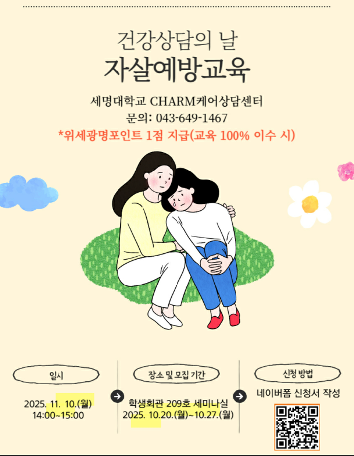 본문 시작 홈으로 학과생활 학과소개 교수소개 교과과정 학과생활 홈페이지가이드 사진게시판 공지사항 사진게시판 전공자료실 동아리 학과행사 사진게시판 페이스북 트위터 프린트 [CHARM케어상담센터] 2025학년도 2학기 자살예방교육 진행 안내 산업디자인학과 57 2025-10-21 목록 이전[긴급공지] 최근 급증 중인 '캄보디아 불법 고용, 납치' 사례 주의 안내 다음 [CHARM케어상담센터] 2025학년도 2학기 알코올중독 예방 및 스트레스 대처 관련 교육 진행 안내 담당부서 : 산업디자인학과 담당자 : 류상현 연락처 : 043-649-1436 최종수정일 : 2024-10-26 만족도조사 만족도 조사 이 페이지에서 제공하는 정보에 대하여 만족하시나요? 매우만족 만족 보통 불만족 매우불만족
