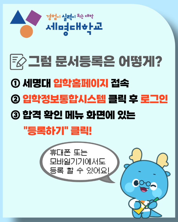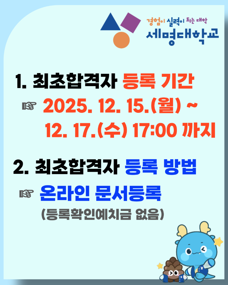 본문 시작 홈으로 학과생활 학과소개 교수소개 교과과정 학과생활 홈페이지가이드 사진게시판 공지사항 사진게시판 전공자료실 동아리 학과행사 사진게시판 페이스북 트위터 프린트 [수시모집] 2026학년도 수시모집 최초합격자 등록안내 산업디자인학과 104 2025-12-15 목록 이전[설경] 세명대학교 설경 다음 [수시모집] 2026학년도 수시모집 충원합격자 발표안내 담당부서 : 산업디자인학과 담당자 : - 연락처 : 043-649-1436 최종수정일 : 2024-10-26 만족도조사 만족도 조사 이 페이지에서 제공하는 정보에 대하여 만족하시나요? 매우만족 만족 보통 불만족 매우불만족