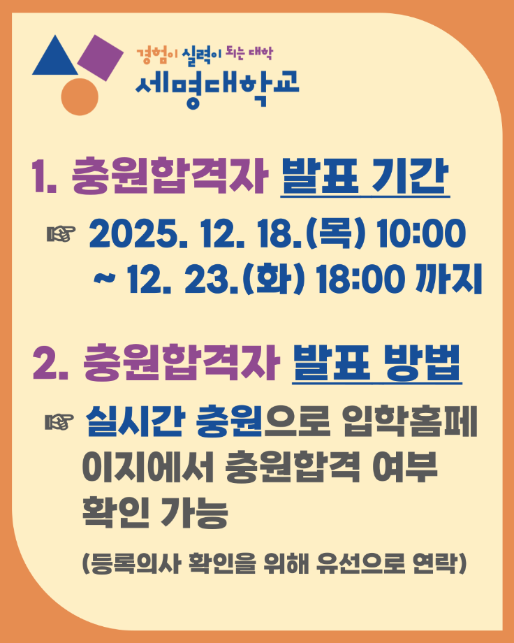 본문 시작 홈으로 학과생활 학과소개 교수소개 교과과정 학과생활 홈페이지가이드 사진게시판 공지사항 사진게시판 전공자료실 동아리 학과행사 사진게시판 페이스북 트위터 프린트 [수시모집] 2026학년도 수시모집 충원합격자 발표안내 산업디자인학과 94 2025-12-18 목록 이전[수시모집] 2026학년도 수시모집 최초합격자 등록안내 다음 [정시모집] 2026 세명대학교 정시모집 전형방법 담당부서 : 산업디자인학과 담당자 : - 연락처 : 043-649-1436 최종수정일 : 2024-10-26 만족도조사 만족도 조사 이 페이지에서 제공하는 정보에 대하여 만족하시나요? 매우만족 만족 보통 불만족 매우불만족