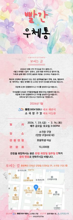 본문 시작 홈으로 MCC News 학과소개 교수소개 학과과정 MCC News MCC SNS 홈페이지가이드 교수 및 졸업생 학과 및 재학생 교수 및 졸업생 미디어 정보통 교수 및 졸업생 페이스북 트위터 프린트 권화숙 교수님 희곡 빨간우체통 공연 안내 미디어콘텐츠창작학과 1002 2026-01-16 권화숙 교수님께서 작성하신 희곡 작품 '빨간우체통'이 연극무대에 올려지게 되었습니다. 자세한 내용은 위 사진을 참고해주시면 됩니다. 목록 이전권화숙 교수님 향기로운 삶, 문인화 전시회 안내 담당부서 : 미디어콘텐츠창작학과 담당자 : - 연락처 : 043-649-1741 최종수정일 : 2024-10-26 만족도조사 만족도 조사 이 페이지에서 제공하는 정보에 대하여 만족하시나요? 매우만족 만족 보통 불만족 매우불만족