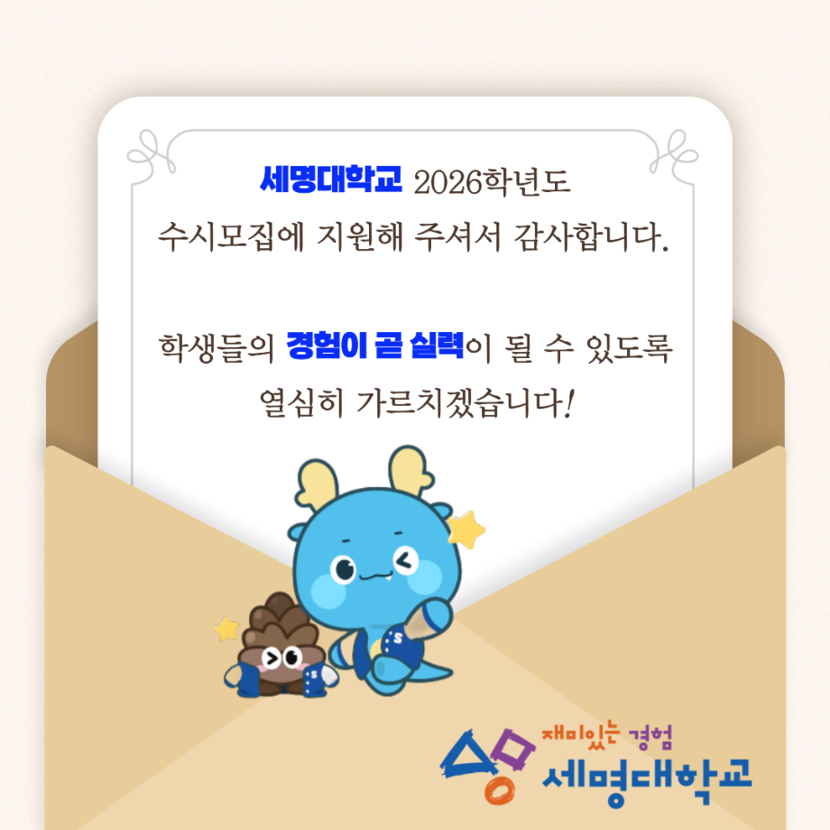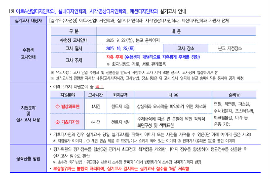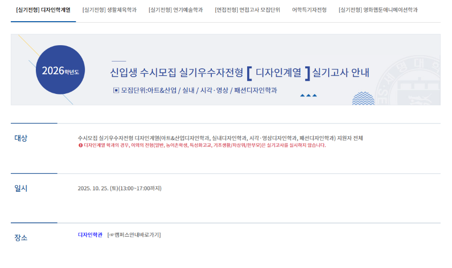 본문 시작 홈으로 입학/AI 학과소개 학과과정 시영소식 입학/AI 학과자랑 SNS소통 홈페이지가이드 입학여기 입학여기 디자인 정보 AI 콘텐츠 연구소(AI 디자인) 입학여기 페이스북 트위터 프린트 2026 수시모집 디자인계열학과 실기고사 안내 - 시각영상디자인학과 시각영상디자인학과 173 2025-10-01 2026 수시모집 디자인계열학과 실기고사 안내- 시각영상디자인학과 실기고사 안내 바로가기 > https://www.semyung.ac.kr/ipsi/sub01_07_03.do 목록 이전8월 12일 -중고등학생 대상 취업 특강- AI 브랜딩 만족도조사 만족도 조사 이 페이지에서 제공하는 정보에 대하여 만족하시나요? 매우만족 만족 보통 불만족 매우불만족